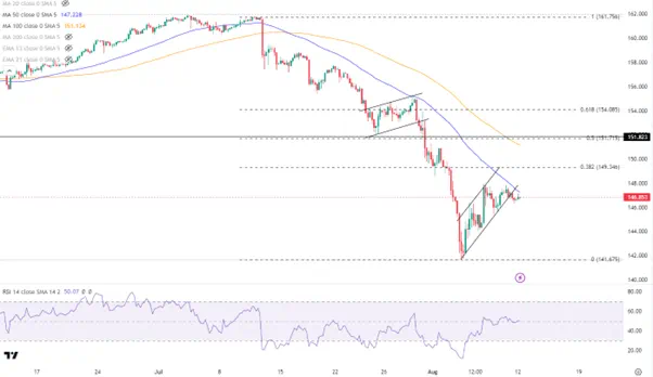 即使日本维持利率不变,美联储的降息预期仍可能继续压缩美日利差,而且汇价7月以来的下行压力短时间很难彻底扭转。因此在修正行情接近149以及151100MA)附近时需要留意再次下探的风险。若跌破图中整理形态,141成为下方的关键支撑。