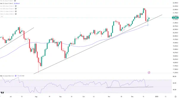 50天均线和8月末以来的上升趋势线的共同帮助下,纳指周五止跌反弹,周一早盘继续回升,RSI指标再次从中性水平拐头向上,小时级别上指数或能继续修复上周的跌幅,若能否能顺利突破周五高点21550一线,多头将重新掌握主动。