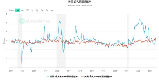 中长期来看,随着特朗普2.0的到来,其“对内减税并驱逐非法移民+对外高关税的政策组合拳有再次推升通胀的风险。最新公布的密歇根大学未来1年和5-10年的通胀预期均升至3.3%,后者更是创下2008年以来的最高水平。对于通胀升高的预期将促使企业和个人在高关税落地之前抢购和囤货,这可能使通胀在短期内难以下行。