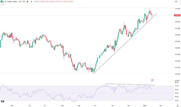 美元指数从9月末以来上涨近10%(下图),其背后有降息预期降温的推动,也有贸易战威胁的助力以及避险情绪的酝酿。若能守住上升趋势线,多头的下一个重要目标为20229月高点114.80,但图中的背离走势也不可忽视。