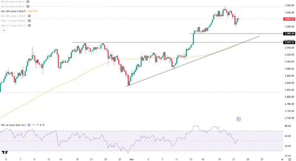 下行方向的首要支撑是上周五低点3000美元心理关口,守住意味着保留短线继续冲高的可能性。反之,则将考验2980以及趋势线2950/60附近。不过潜在的关税和地缘风险有望限制金价跌幅。
