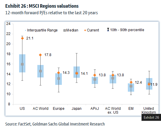 主要经济体股市的远期市盈率  来源:高盛,FactSet