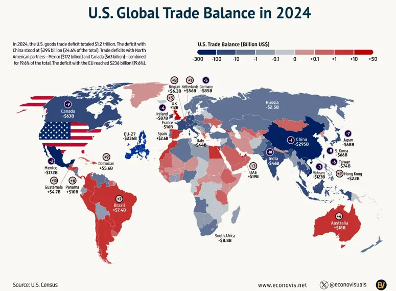 由于过去两个月的关税闹剧中已经点名了中国、墨西哥、加拿大这三个主要的贸易对象和逆差国,因此这一波的对等关税可能涉及其他贸易逆差国,如欧盟、越南、日本等(下图蓝色部分),也可能对平均关税税率和非关税壁垒高于美国的国家出手,如印度、南非、韩国、东南亚国家等。而同时满足上述两个条件(对美国高顺差和高关税)的国家是印度、韩国和越南。此外,有猜测认为特朗普会对各国进口商品无差别加征20%的关税(利好美元),也可能对货币低估的国家予以关税打击。