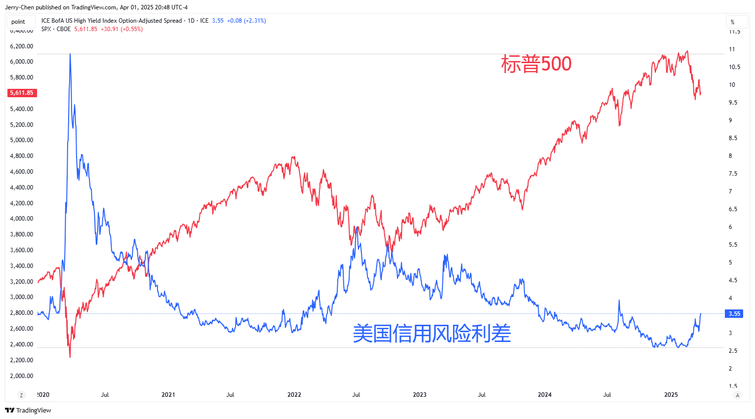 美国信用风险利差 vs 标普500