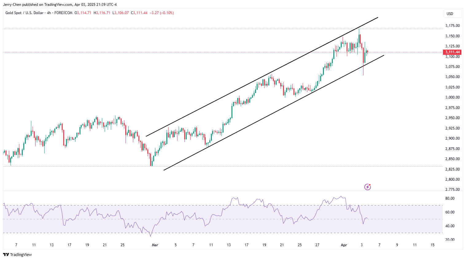 黄金周四经历了大起大落,但从结果来看,既没有发生“抛售一切”的局面(通道下轨3080附近提供了有效支撑),也没有因为关税政策而出现爆发式上涨(因为此前黄金的持续上涨已经计价了这部分因素)。但有一点值得注意的是,和美股和美债一样,目前的黄金价格可能还没有完全反应衰退的预期,这也是令很多机构和投资者继续看好黄金前景的原因。