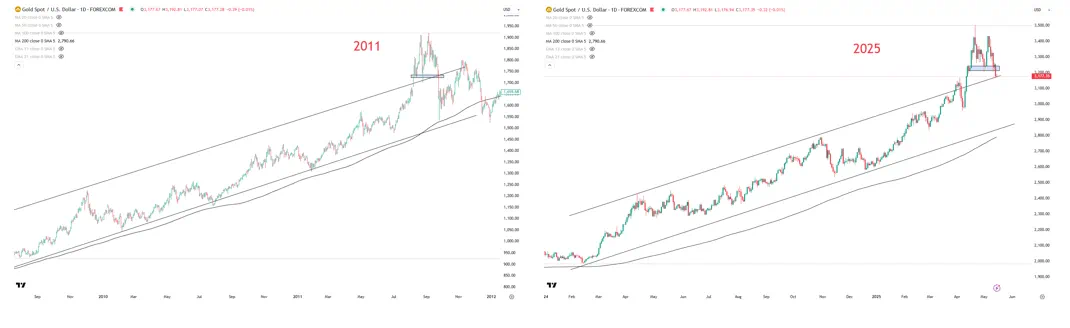此时我们不得不再次将黄金当前的走势和2011年来做对比,两者都是经历了长达数年的上行周期,都一度高出200天均线25%以上,都是在末端加速冲高后失去动能形成顶部结构