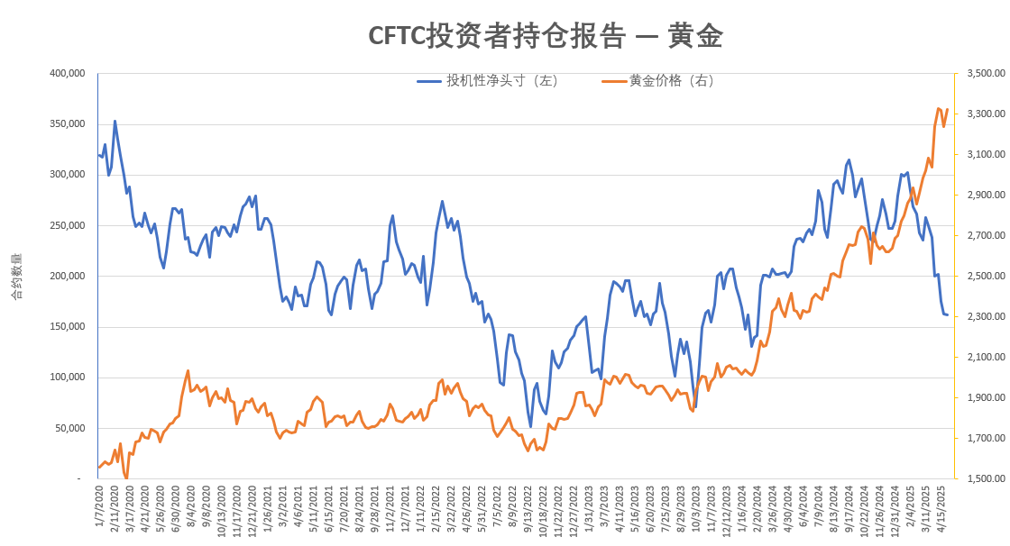 黄金期货投机性多头头寸 vs 金价  来源:CFTC, Forex.com