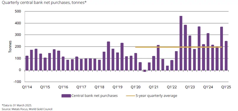 全球央行的黄金净买入量 2014-2025   来源:世界黄金协会