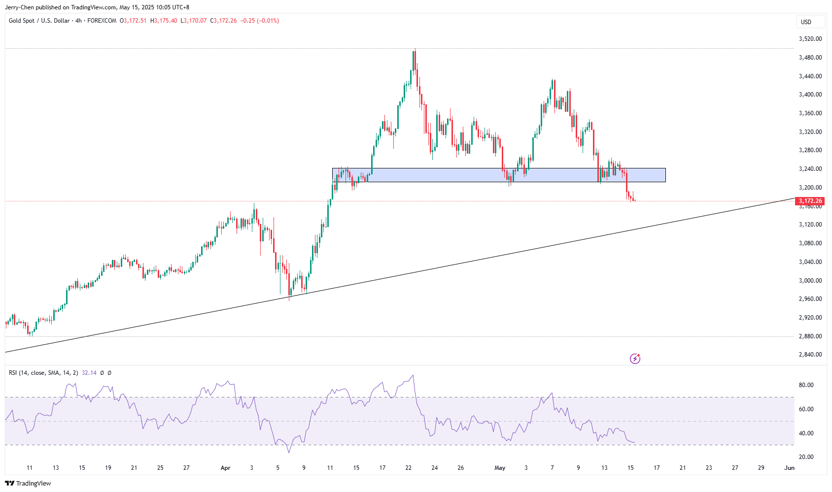 4小时级别来看,跌破3200美元的关键支撑后,金价恐下探年初以来的上升探趋势线3125附近,空头在更下方的目标则为通道下轨2900美元附近。