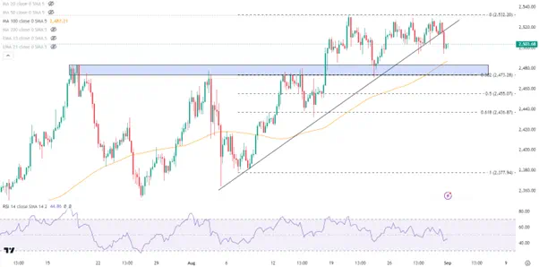 4小时级别上,跌破8月上升趋势后金价目前徘徊在2500美元附近,RSI指标温和运行。下方需要留意2470/80区域的关键支撑,其次是2450一线,毕竟日线和周线图上的背离尚未得到修正。上行方向,历史高点2531显而易见是多头的目标。