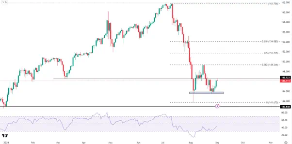 突破后顺势看高149.35一线,这里是8月初至中旬的反弹折戟的地方。反之,则延续震荡下行走势,恐下探143.50以及142下方。